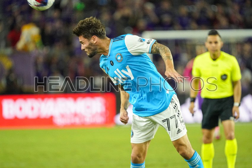 Orlando, Florida, USA, March 18, 2023, Charlotte FC MIdfielder Kamil Jozwiak #77 makes a header at Exploria Stadium. (Photo Credit: Marty Jean-Louis)