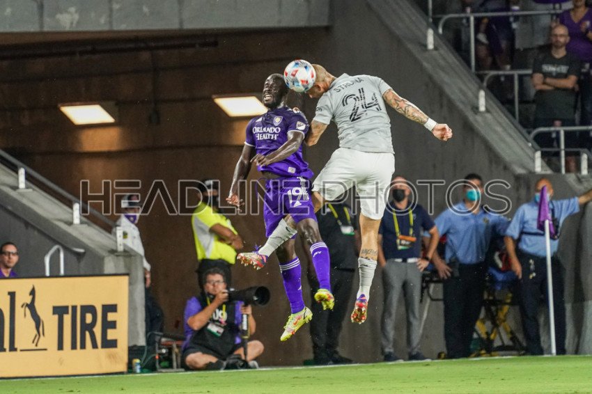 Orlando, Florida, USA, October 20, 2021, CF Montreal Alijaz Struna and Orlando City SC Midfielder Benji Michel #19 fight for the header at Exploria Stadium. (Photo Credit: Marty Jean-Louis)